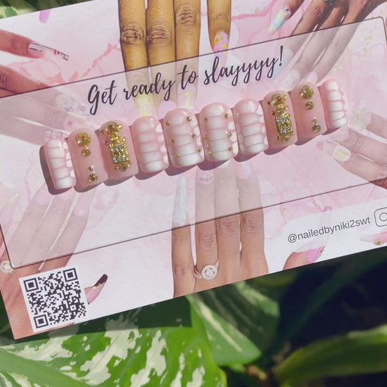 Get dolled up to head out in this blinged out set. Set made with 3d charms and rhinestones. Available in you choice of tip style and length.