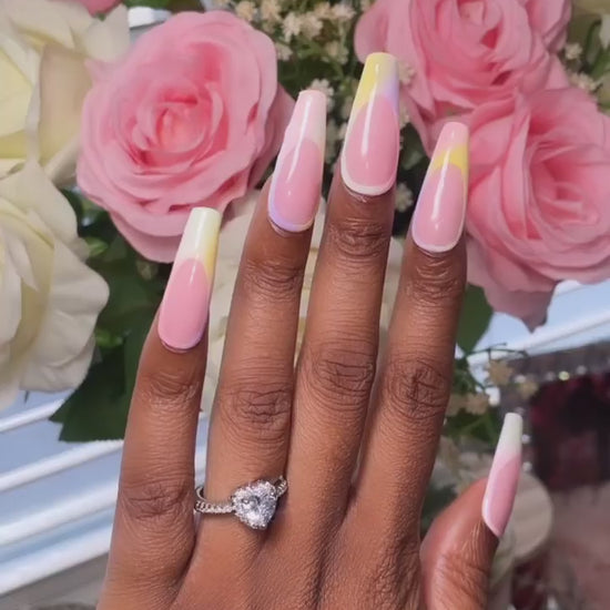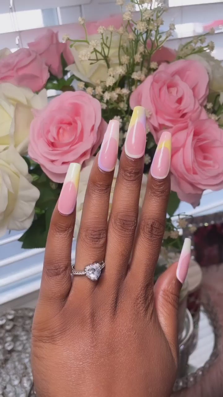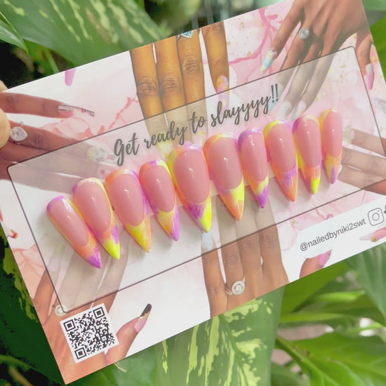 Ombre, French tipped, summer inspired set in shades of peach, lime, pink, purple, and yellow. Set available in your choice of tip style and length.