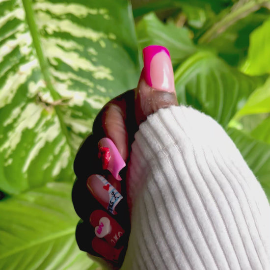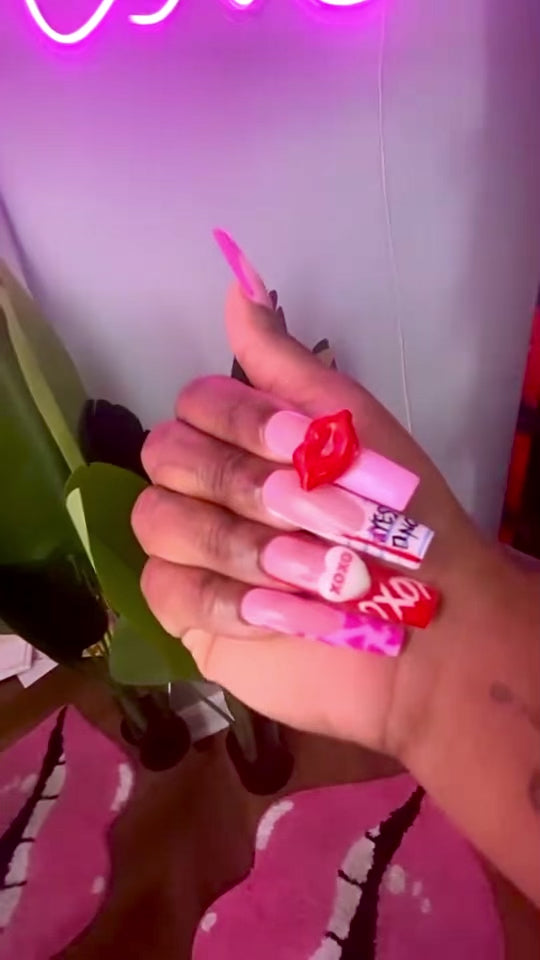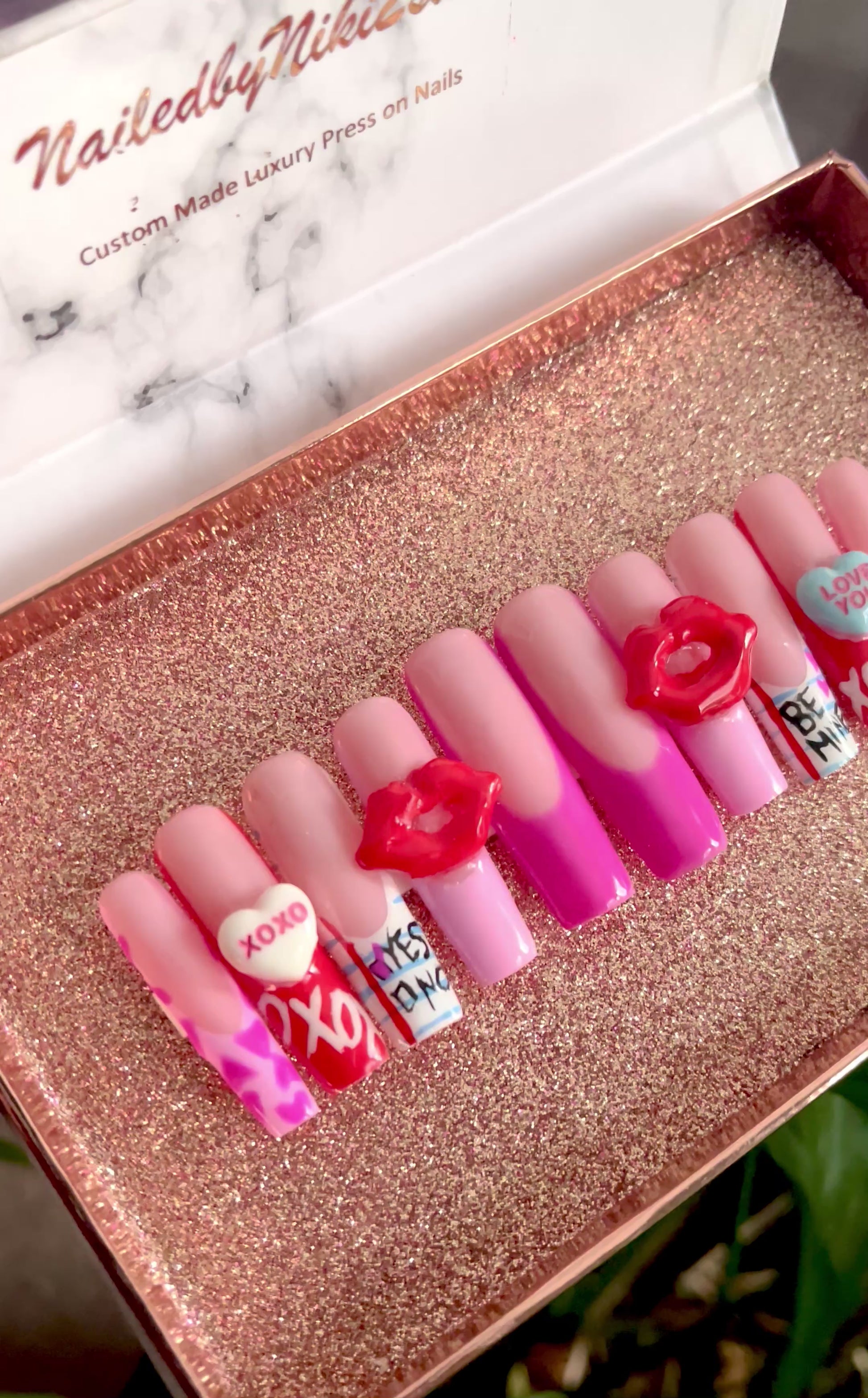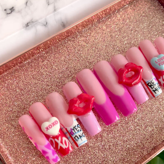 Valentine inspired, French tipped set Hand made red lips & candy charms. Set available in your favorite tip shape and length.