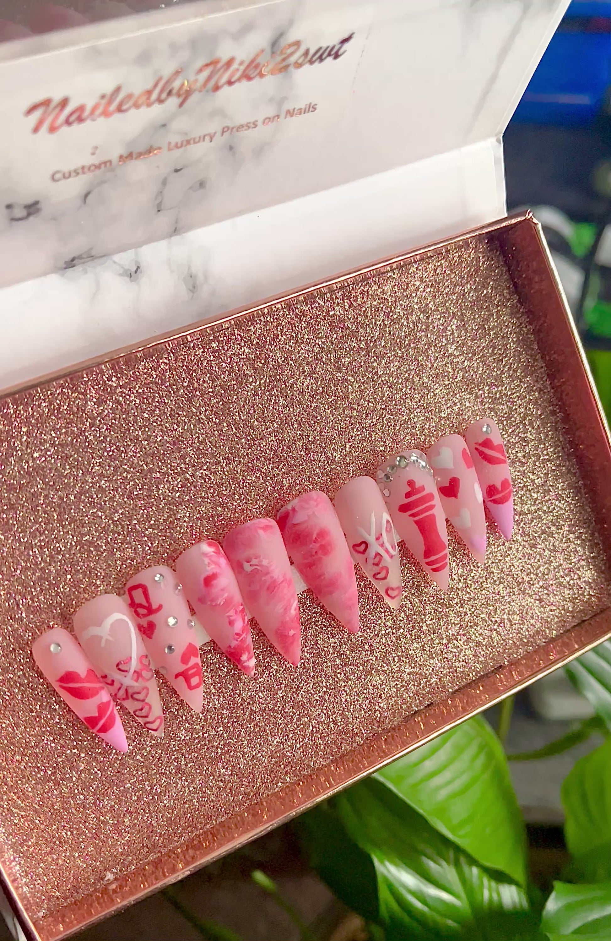 Queen of Hearts Valentines inspired red, pink, & white hand painted set. Set shown in a matte finish.